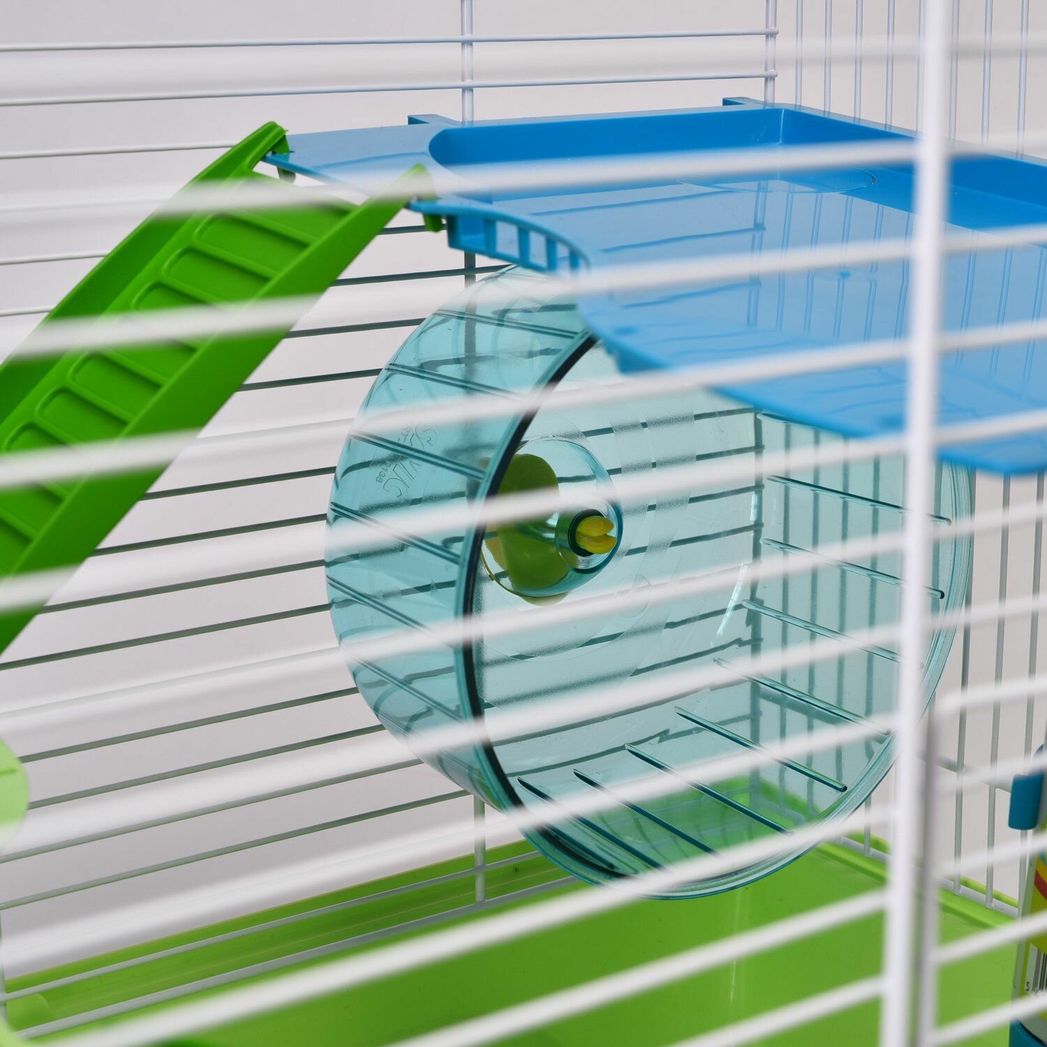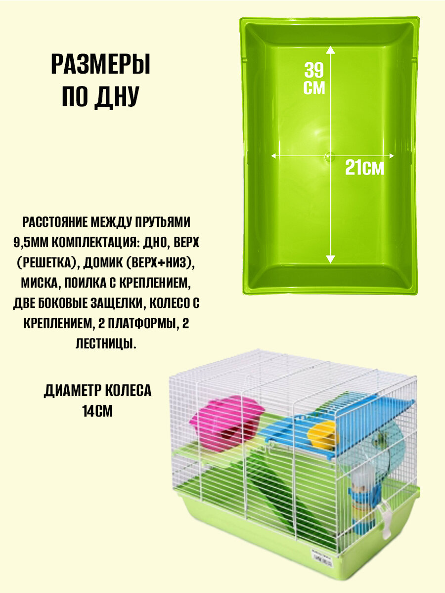 | Плюсы: | Большой размер клетки, есть колесо, поилка, емкость для корма. |