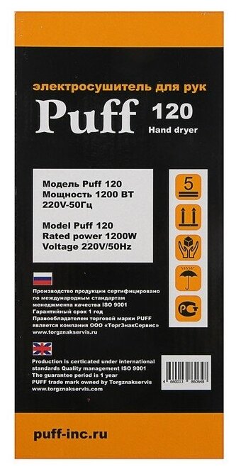Puff уценка Сушилка для рук Puff-120, 1.2 кВт, 182х120х267 мм, белый