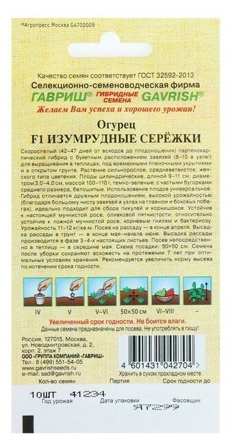 Семена овощей Гавриш "Огурец Изумрудные сережки", F1, 10 шт., корнишон, 2 пакета