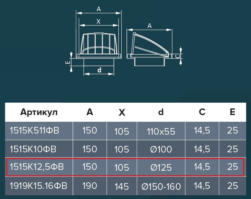Вытяжной стенной выход ERA 1515К12,5ФВ