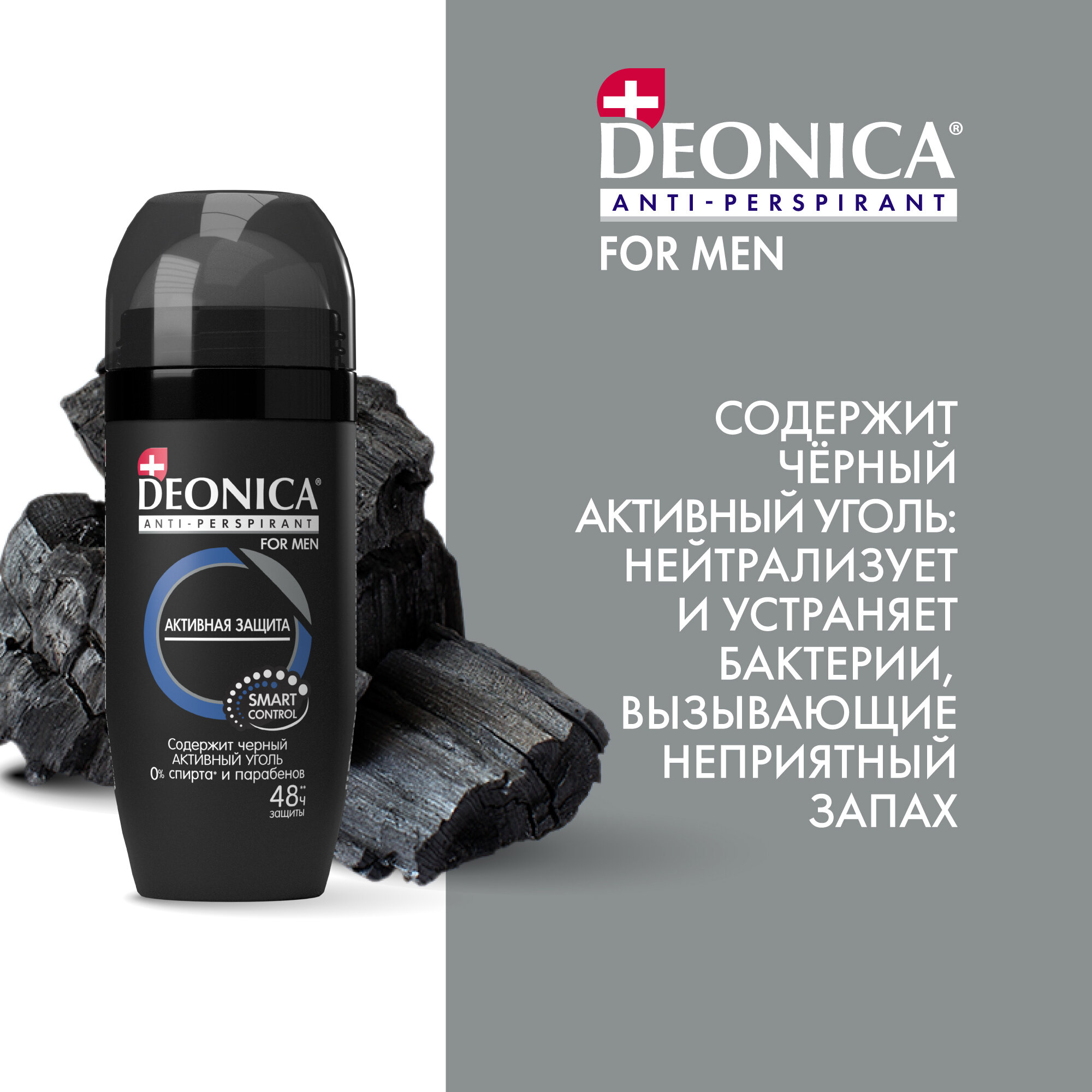Дезодорант мужской антиперспирант Deonica For Men "Активная защита". Ролик, 50 мл. Содержит активный уголь, нейтрализующий бактерии. Не оставляет следов на одежде