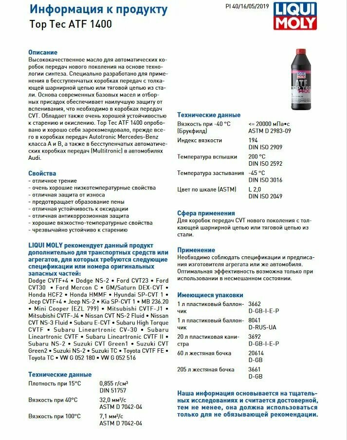 Ниже Вы можете прочитать отзывы на Трансмиссионное масло Liqui Moly CVT Top Tec ATF 1400 для вариаторов, HC-синтетическое, 1 л., ознакомится с подробными характеристиками, посмотреть интересные обзоры и фотографии на Трансмиссионное масло Liqui Moly CVT Top Tec ATF 1400 для вариаторов, HC-синтетическое, 1 л..
