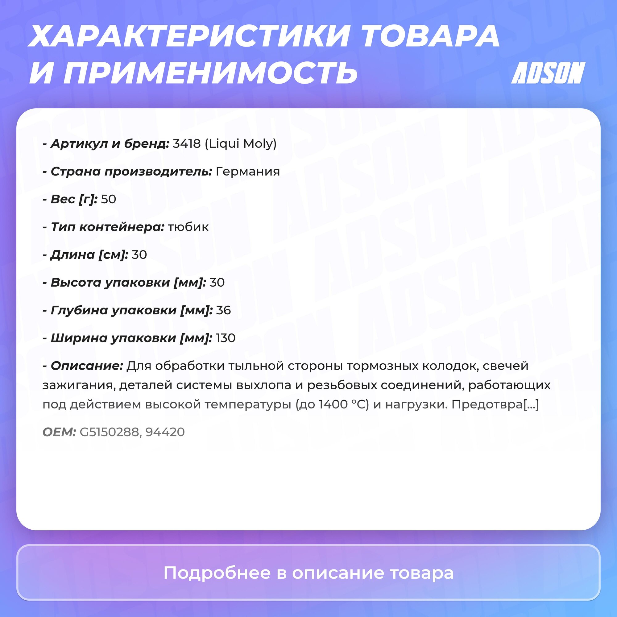 | Отзыв: | Отличная смазка, наношу на резьбовые соединения в авто, чтобы потом легче открутилось, не прикепало, всё отлично, но объём конечно за эти деньги маловат, по фото казалось будет больше, тут же пол. тюбика зубной пасты по размеру, что впринципе видно в описании - 50 грамм. |