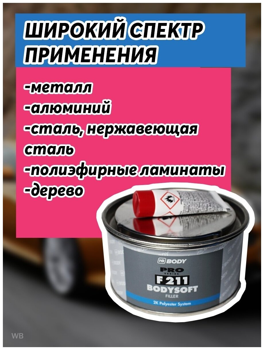 Шпатлевка универсальная для кузова автомобиля HB BODY 211 BODYSOFT 0,38 кг / 2К полиэфирная мультизернистая шпатлевка с отвердителем в комплекте