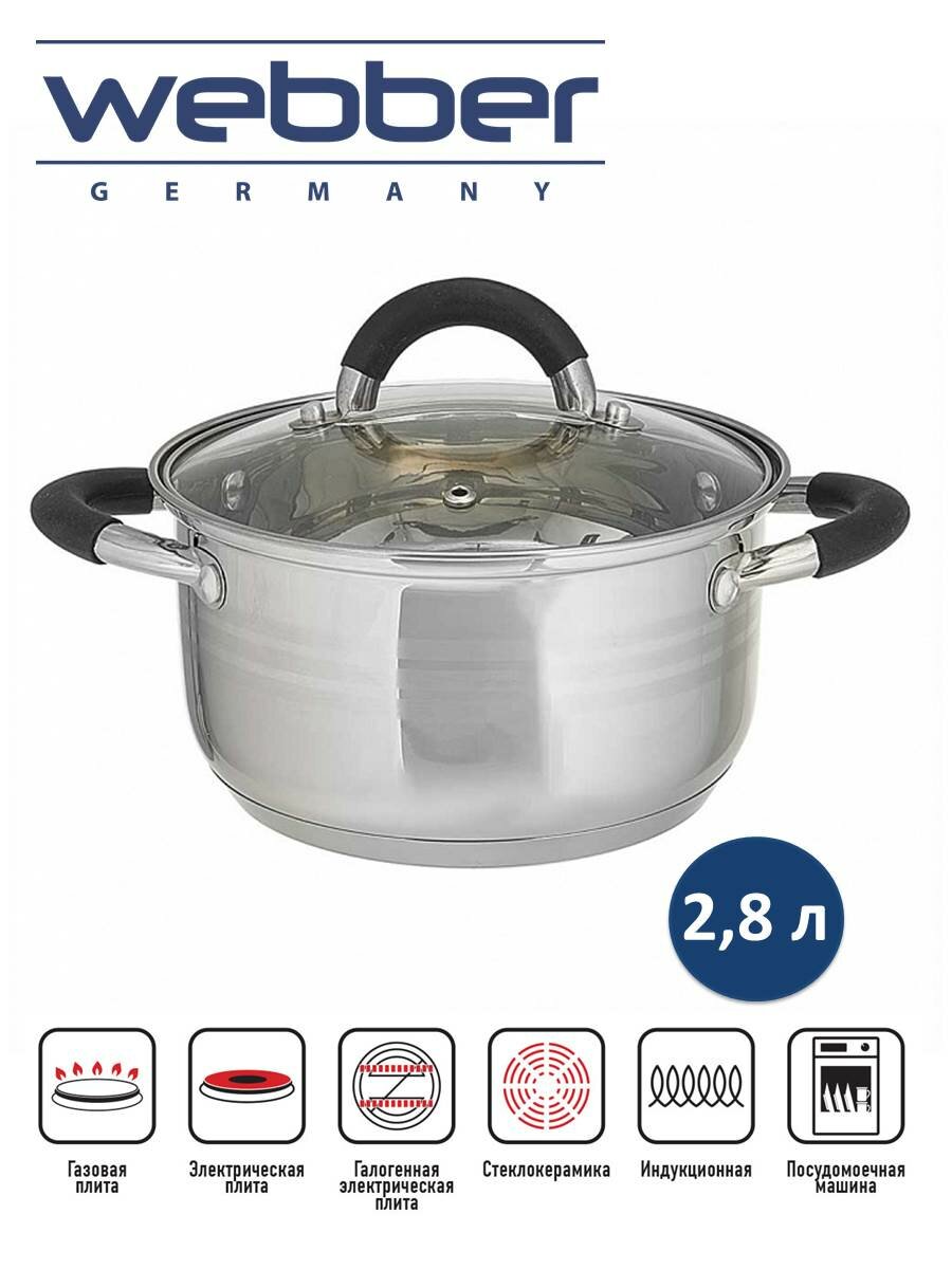 Кастрюля WEBBER BE-352/2 со стеклянной крышкой, 2,8 л, серебристый