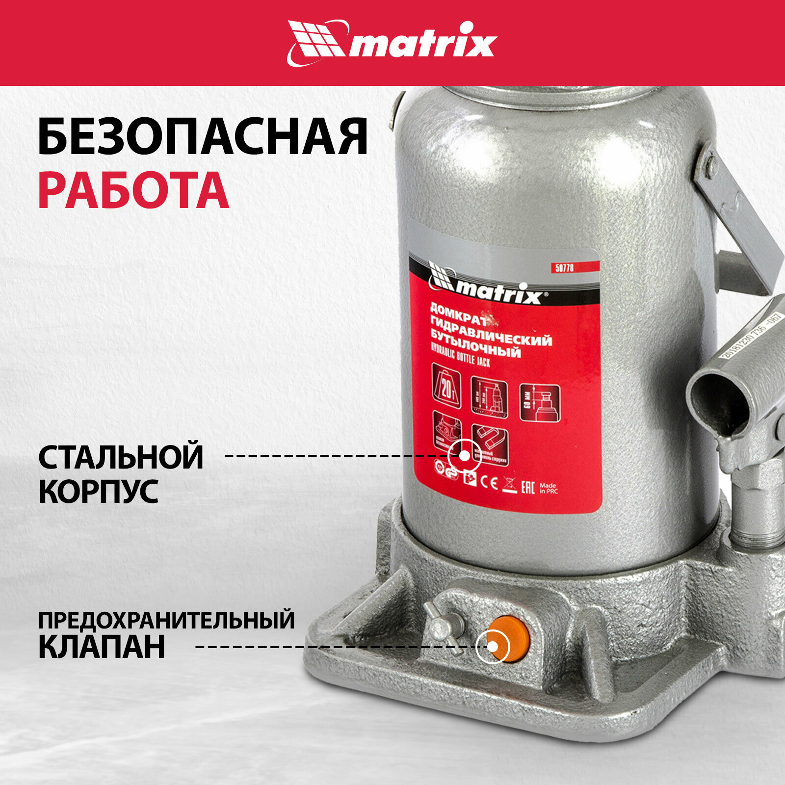 MATRIX 50778 Домкрат гидравлический бутылочный, 20 т, h подъема 244-449 мм MATRIX 50778 MATRIX 50778