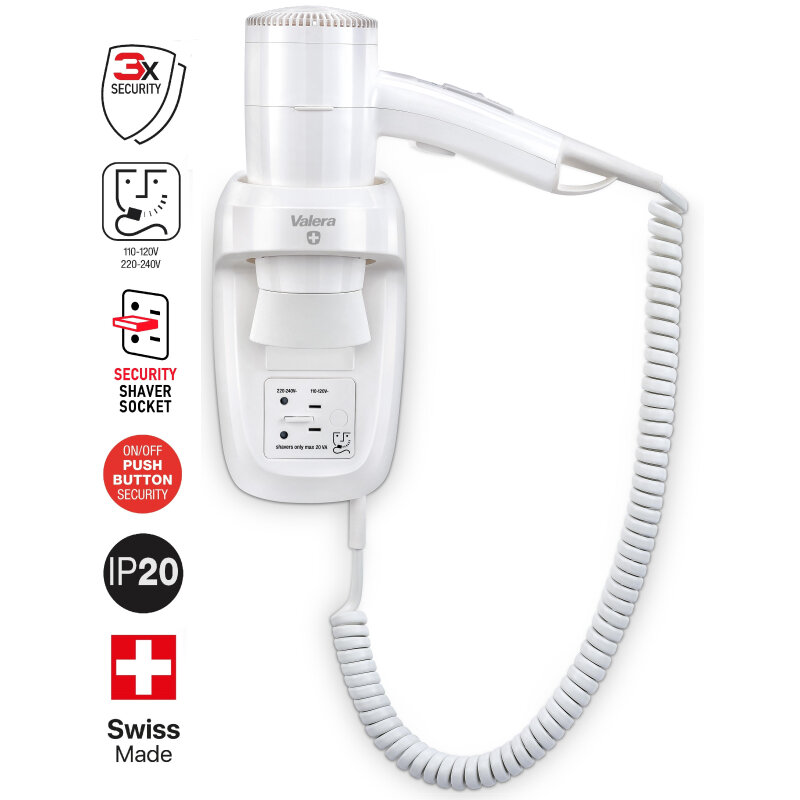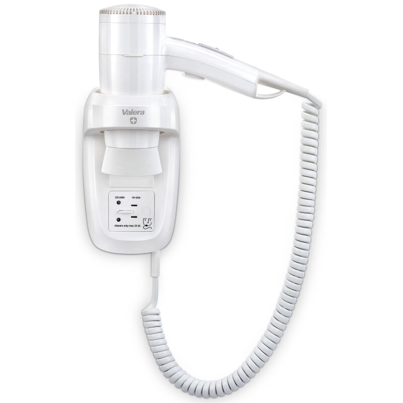 Фен настенный Valera Hospitality Premium Smart 1600 Shaver (533.05/032.05), мощность 1600 Вт, кнопка включения/выключения, тройная система защиты, холодный воздух, концентратор, розетка для бритвы, спиральный кабель, настенный держатель с выключателем