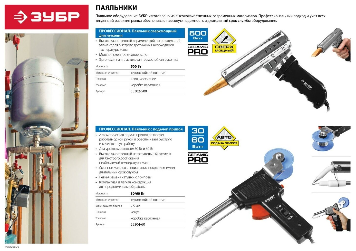 Паяльник с подачей припоя, 2 мощности (30Вт/60Вт), диаметр проволоки припоя от 1 до 3мм,ЗУБР "ПРОФЕССИОНАЛ"55304-60
