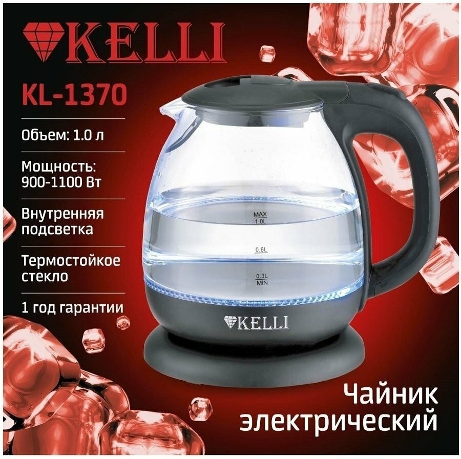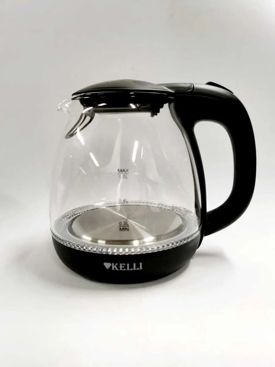 Kelli Чайник электрический KELLI KL-1370, стекло, 1 л, 1100 Вт, чёрный