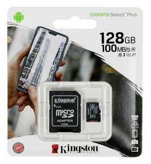 Карта памяти Kingston microSDXC 128 GB Canvas Plus UHS-I U1, 100 Мб, с, class 10 (SDCS2/128GBSP)