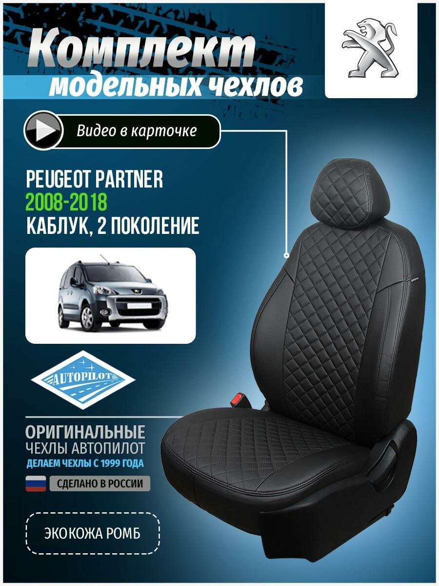 Чехлы для Peugeot Partner 2 2008-2018 Автопилот Черный Экокожа с ромбом pe-pr-t5m-chch-r