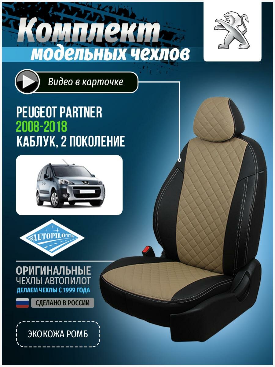 Авточехлы для Peugeot Partner 2 2008-2018 Автопилот Бежевый Экокожа с ромбом pe-pr-t5m-chebe-r
