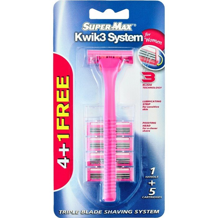 Super-Max Станок для бритья женский, SUPER-MAX KWIK 3, многоразовый станок + 4 сменных картриджа с тройным лезвием