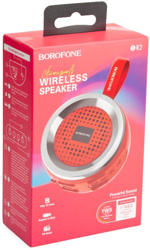 Портативная колонка BOROFONE BR2 Aurora Sports BT 5.0, 3W, microSD / USB / FM, красный