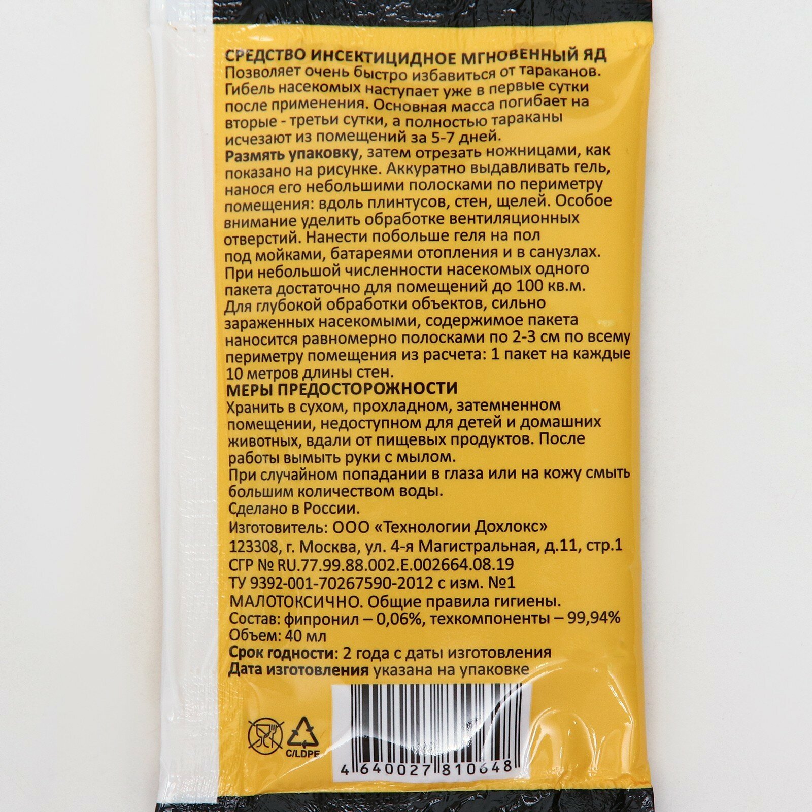 Дохлокс Гель инсектицидный Универсальный Яд от тараканов, муравьев, мух, блох, мокриц и др. насекомых, 40 мл в пакетике