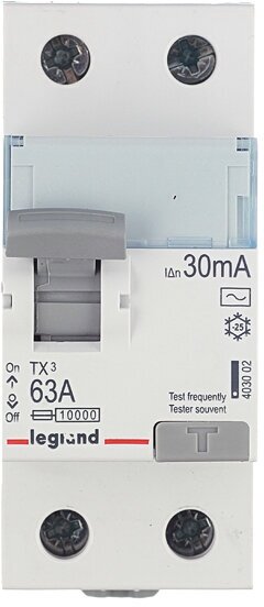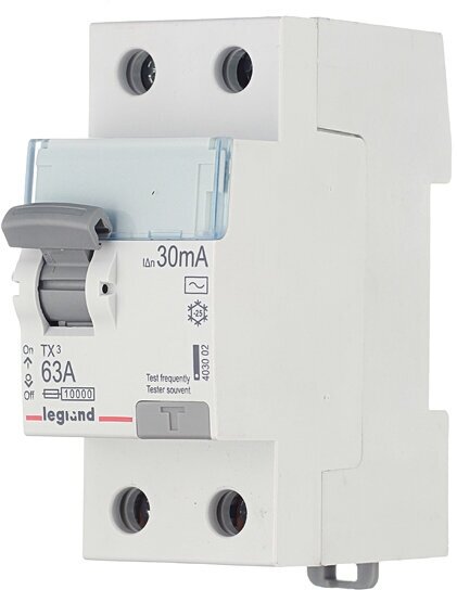 Устройство защитного отключения (УЗО) Legrand TX3, 2 полюса, 63A, 30 mA, тип AC, электро-механическое, ширина 2 DIN-модуля