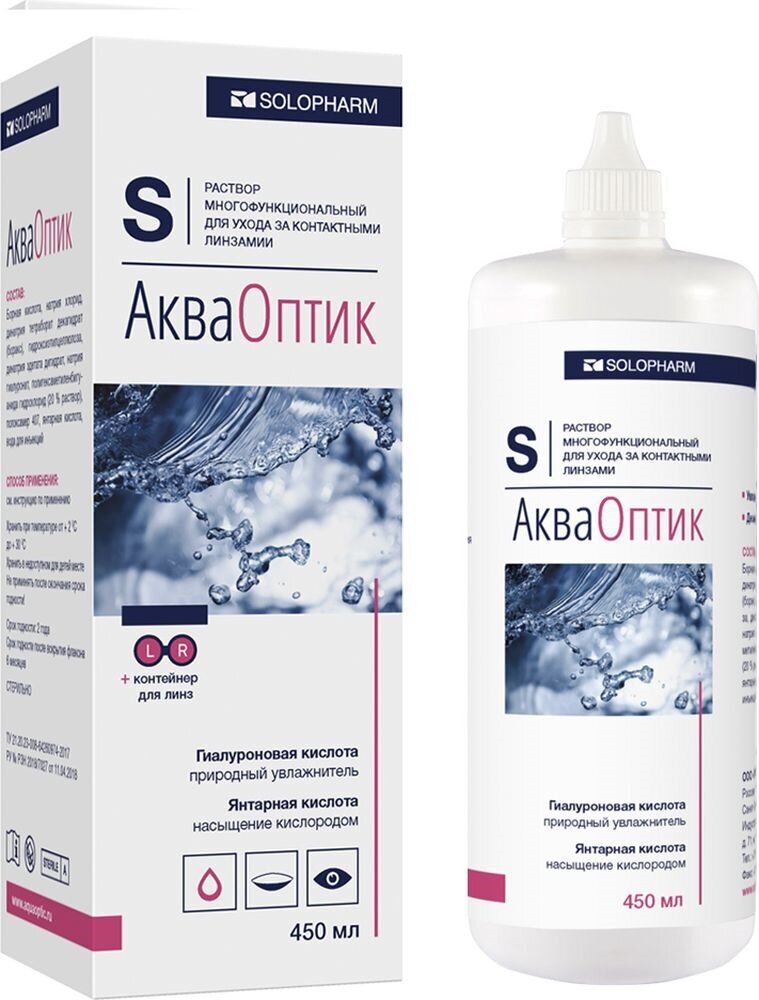 Купить Раствор многофункциональный для контактных линз SoloPharm АкваОптик, 450 мл с контейнером для линз