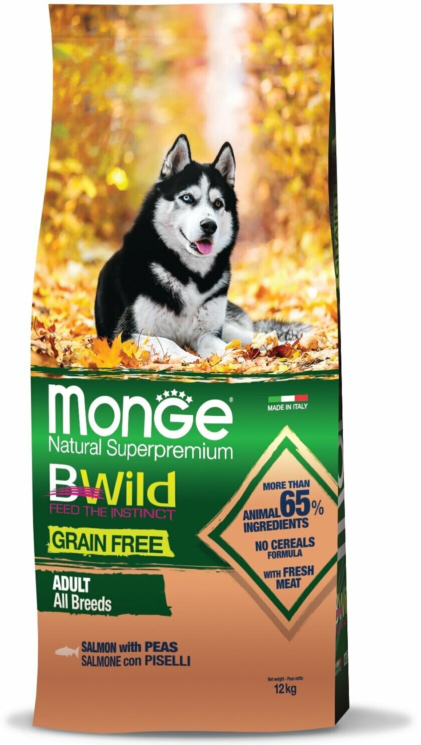 Сухой корм для собак Monge BWILD Feed the Instinct, лосось, с горошком 1 уп. х 1 шт. х 12 кг