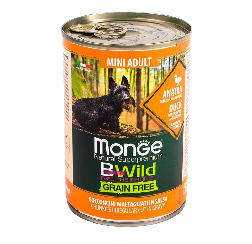 Влажный корм для взрослых собак мелких пород Monge Dog BWild Grain Free Mini беззерновой с уткой, тыквой и кабачками в консервах 400 г (24 шт в уп)