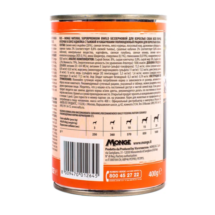 Влажный корм Monge Dog BWild GRAIN FREE для взрослых собак, из индейки с тыквой и кабачками, консервы 400 г