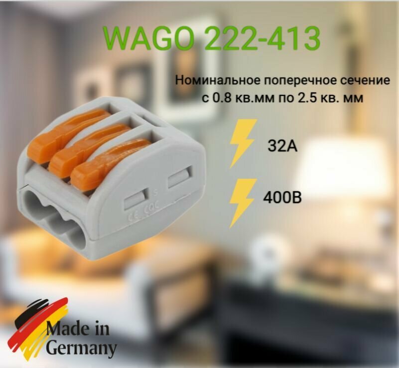 Клемма WAGO.222-413 без пасты для медных проводов 3х0.08...4мм.кв. оригинал ( 1 упаковка )- 50шт