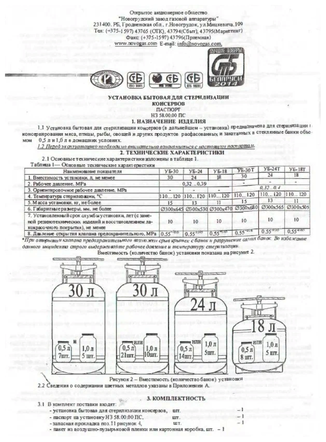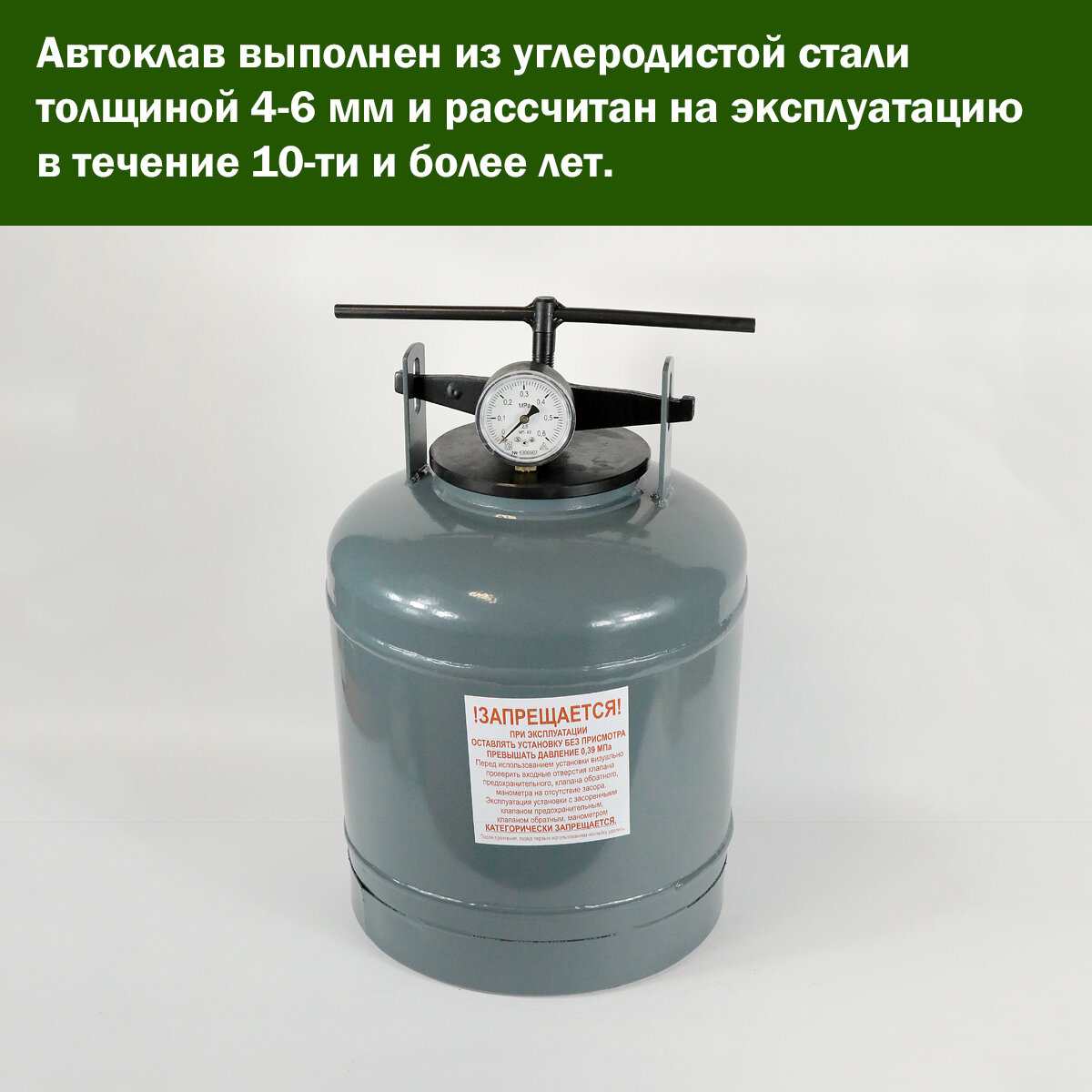 | Плюсы: | Простой, удобный, надежный белорусский автоклав. Вместимость: 21 штука поллитровых банок. |