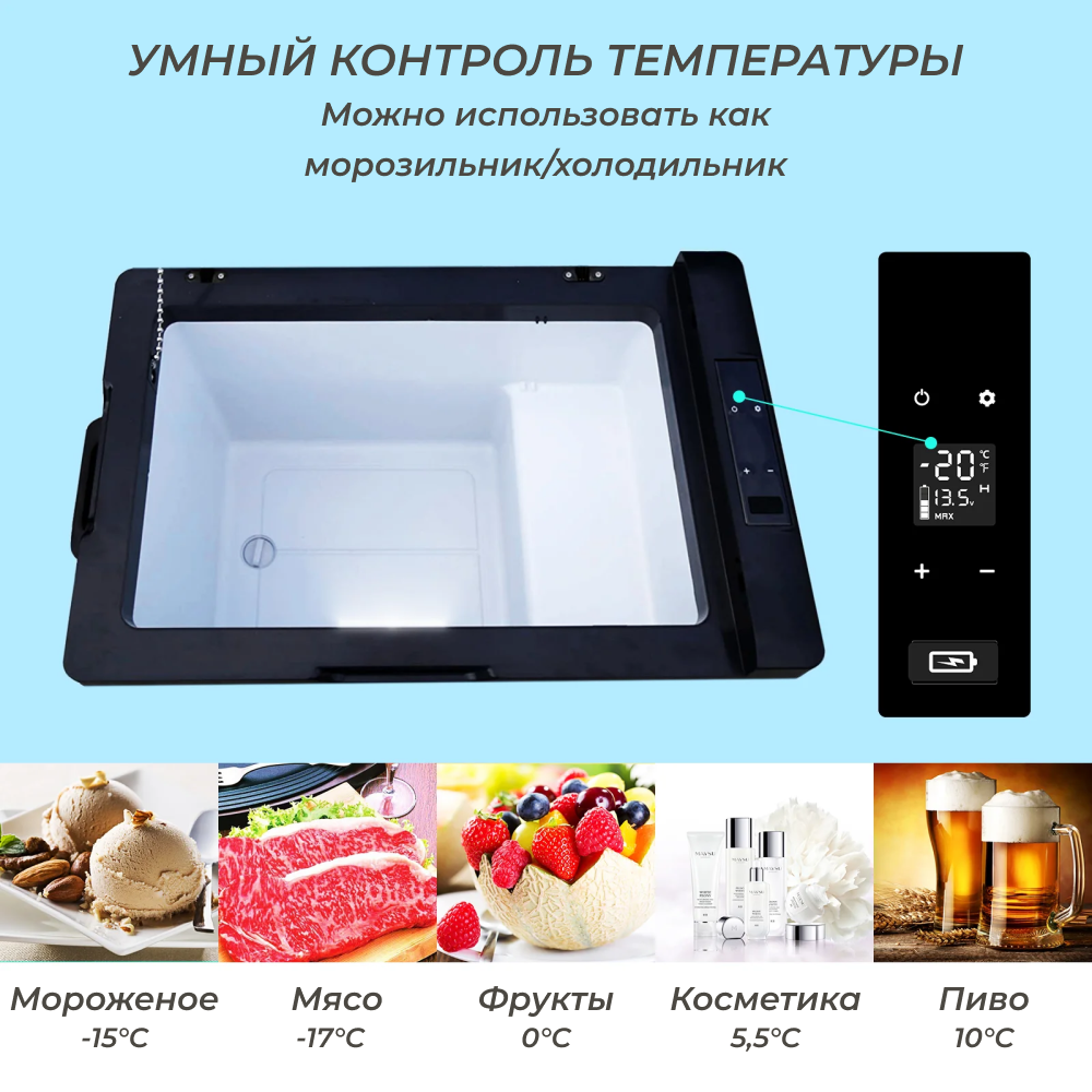 | Плюсы: | Тихий, быстро замораживает, управление через блютуз, питание 12,24,220 вольт |