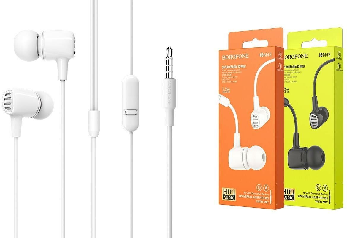 Наушники внутриканальные Borofone BM43, Remy, внутриканальные, микрофон, кнопка ответа, регулятор громкости, цвет белый