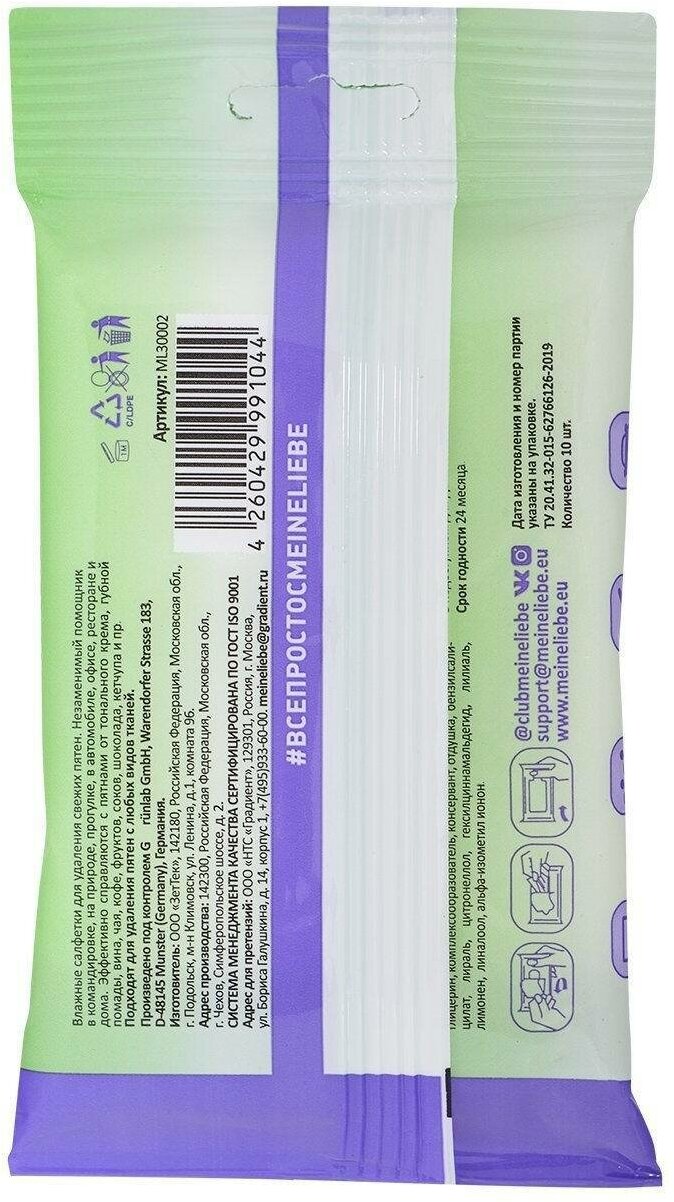 Салфетки влажные Meine Liebe Пятновыводящие для всех типов тканей 10шт
