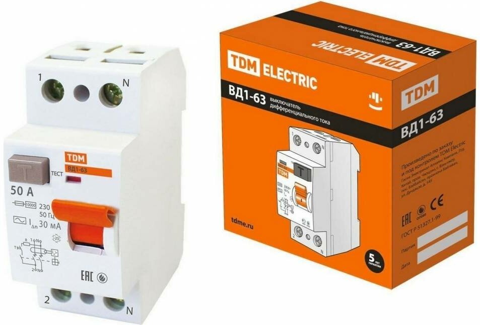 ТДМ Электрик ВД1-63 УЗО 2Р 63А хар-ка АС 30мА / TDM Electric ВД1-63 устройство защитного отключения 2 полюса 63А хар-ка АС 30мА
