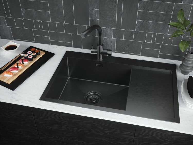 Комплект Paulmark Lassan PM304444-GM вороненая сталь + Смеситель Paulmark Essen 213011-GM для кухонной мойки, вороненая сталь