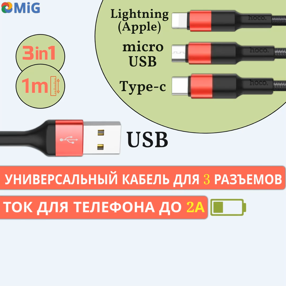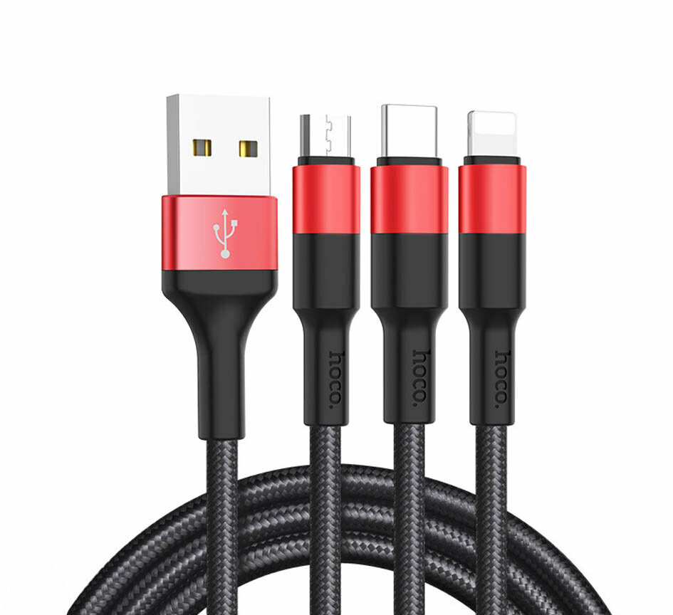 Кабель HOCO X26 Xpress USB на 3in1 (Micro + Lightning + Type-C),2A, 1 метр черный с красным, для быстрой зарядки гаджетов