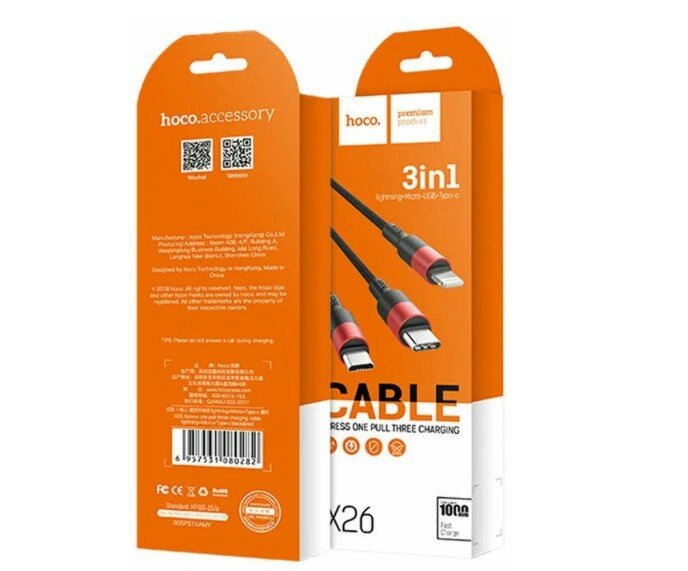 СохранитьКабель Hoco X26 Xpress USB - Lightning/MicroUSB/USB Type-C, 1 м, 1 шт., черный/красный интересное: