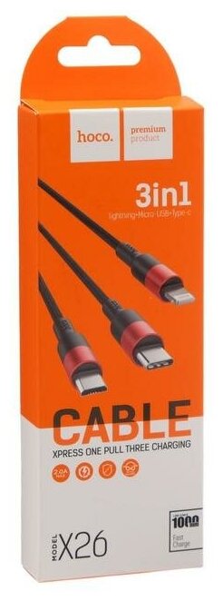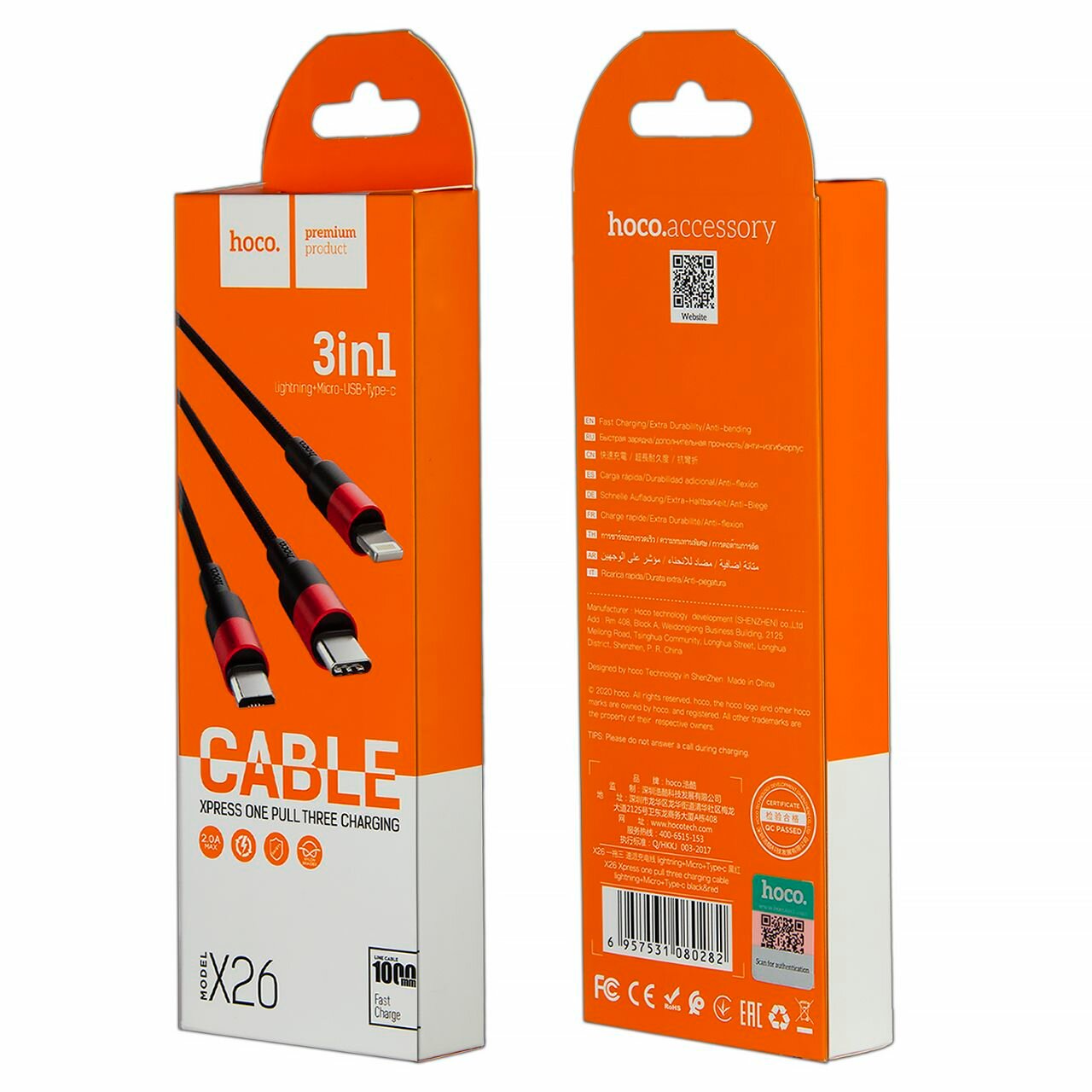 Кабель Hoco X26 Xpress USB 3в1 - Lightning/MicroUSB/USB Type-C, 1 м, 1 шт., черный/красный
