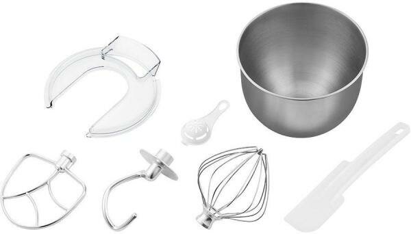 Пришел очень хорошо упакован,без видимых повреждений. Цельнометаллический,красивый дизайн,выглядит стильно и лаконично. В комплекте три насадки - для теста,венчик для взбивания,лопасть для перемешивания ингредиентов. Так же в комплекте есть приспособление для отделения желтка от белка и крышка на чашу. Единственный минус для меня - на чаше нет ручки,с ней было бы гораздо удобнее. В работе пока не пробовали,очень надеемся,что порадует. |