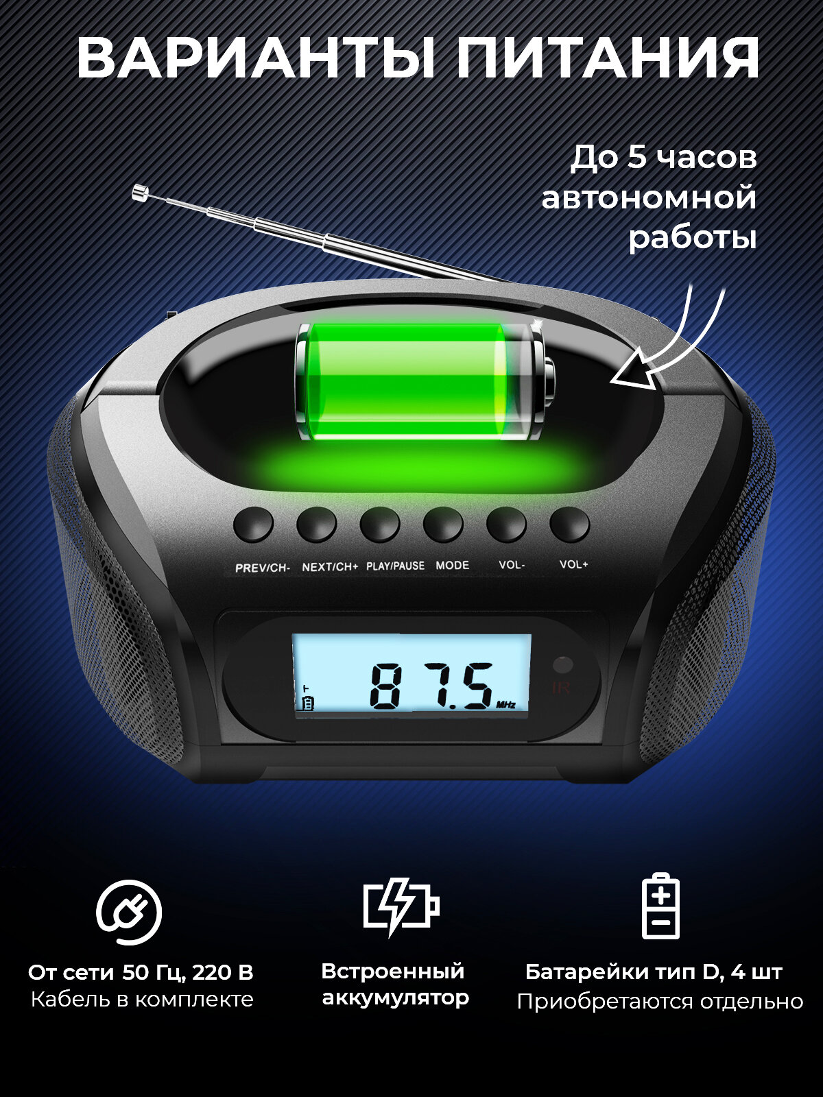 | Отзыв: | Замечательный магнитофон дачного варианта. Радио ловит хорошо, флешки читает, aux работает. Примерно часов 10 работает на аккумуляторах. |