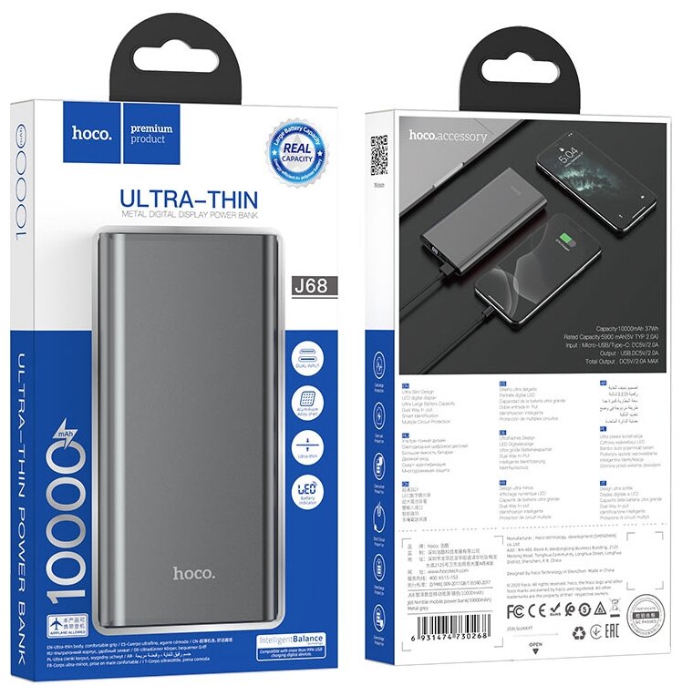 Внешний аккумулятор Hoco J68 Resourceful 10000mAh 1хUSB/LED- дисплей (серый)