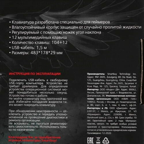 Игровая клавиатура проводная SmartBuy RUSH 200 Raven, влагостойкая
