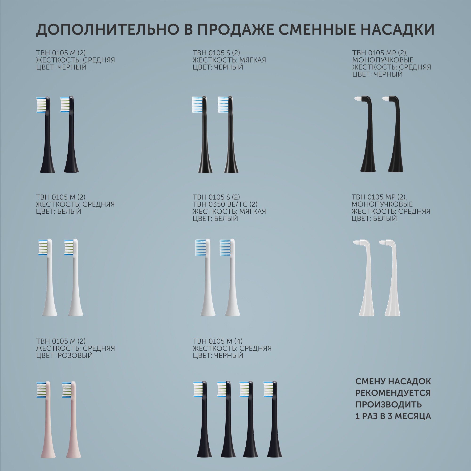 - сменные насадки меняю не часто, последнюю из набора поставил через полгода после покупки - 5 режимов, основной сенсетив, остальные использую 1-2 раза в месяц |