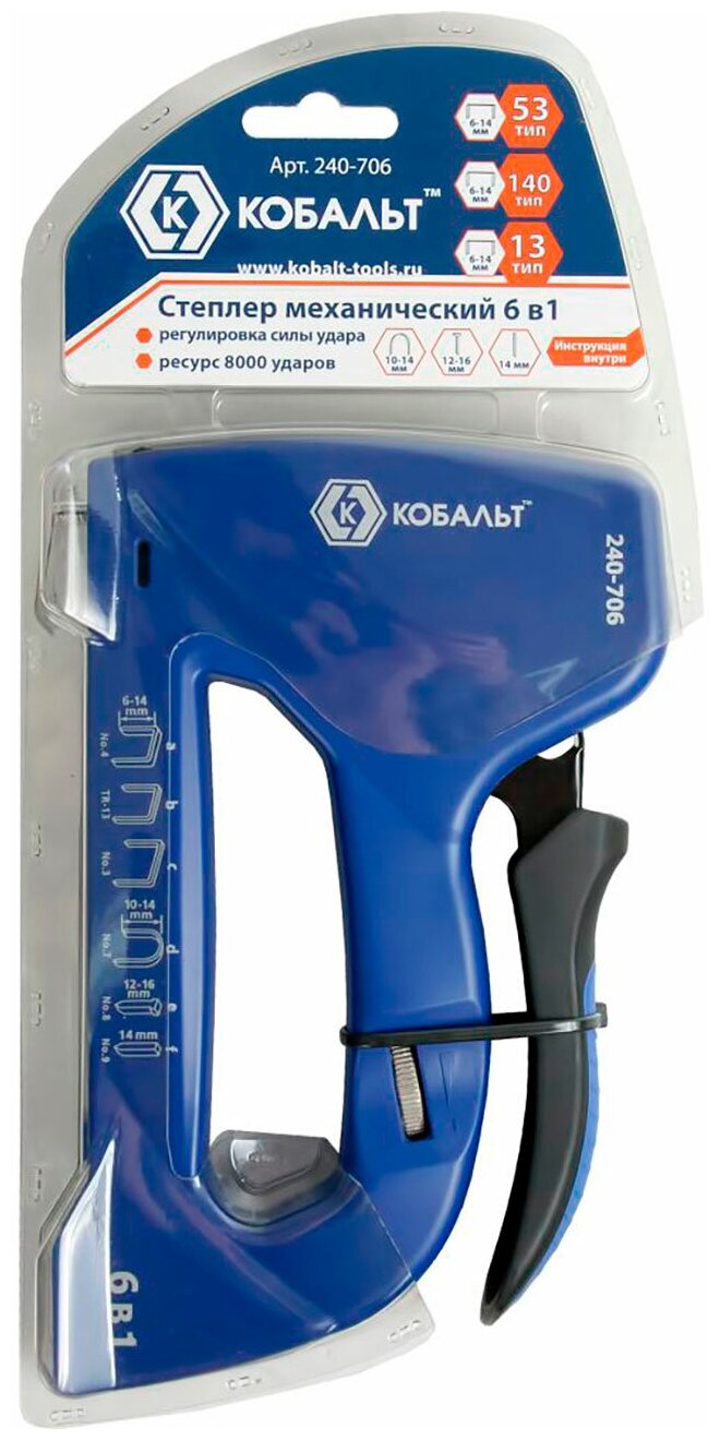 Степлер Кобальт 6в1 скобы 6-14 мм,тип 53,140,13,скобы для кабеля 10-14 мм,шпильки, гвозди, регулятор удара, ударопрочный пластик,ресурс 8 000 ударов, 240-706