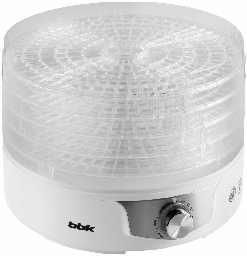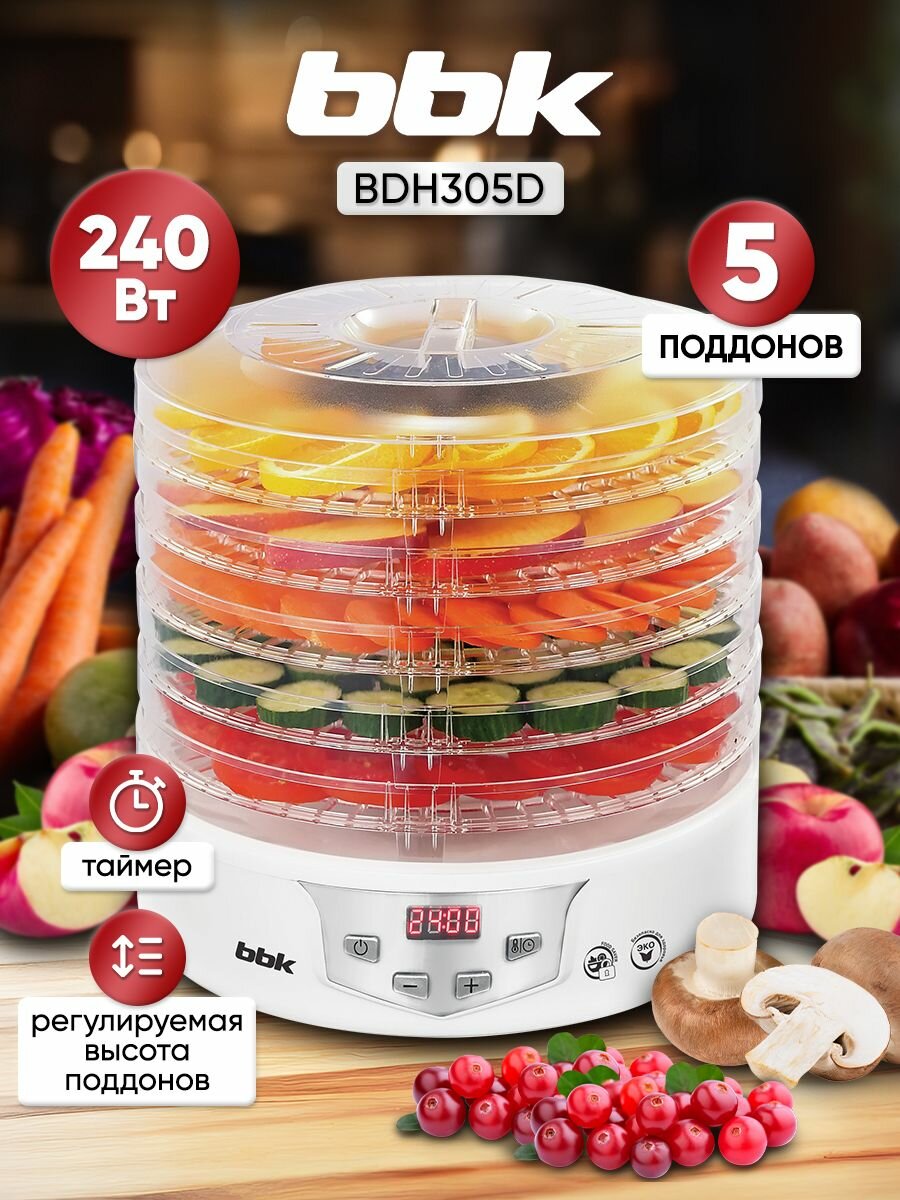 Сушилка для овощей и фруктов электрическая BBK BDH305D, Сушильная машина конвективная, 240Вт, 5поддонов, диапазон 35-70С, электронное управление, белый/серебро