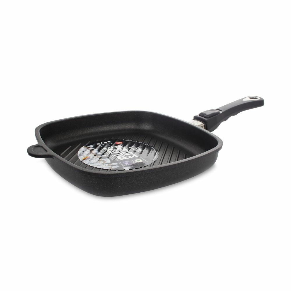 СохранитьСковорода гриль квадратная 28х28 см с антипригарным покрытием со съемной ручкой AMT Gastroguss арт. AMT E285G интересное: