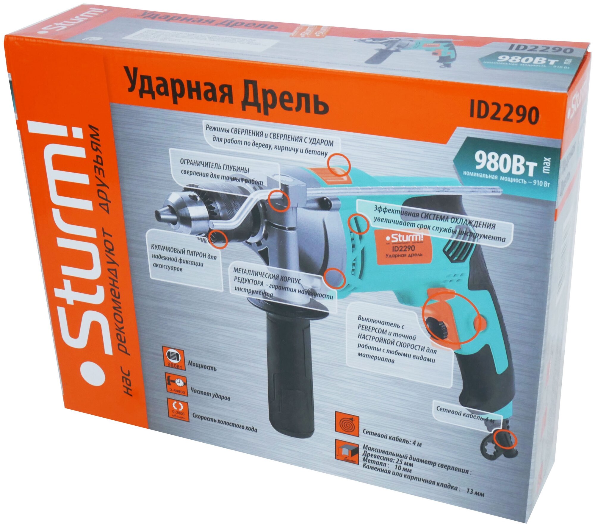 ID2290 Дрель ударная 980Вт, 0-2800об/мин, 0-44800уд/мин, металлический редуктор, шн 4м, Sturm! интересное: