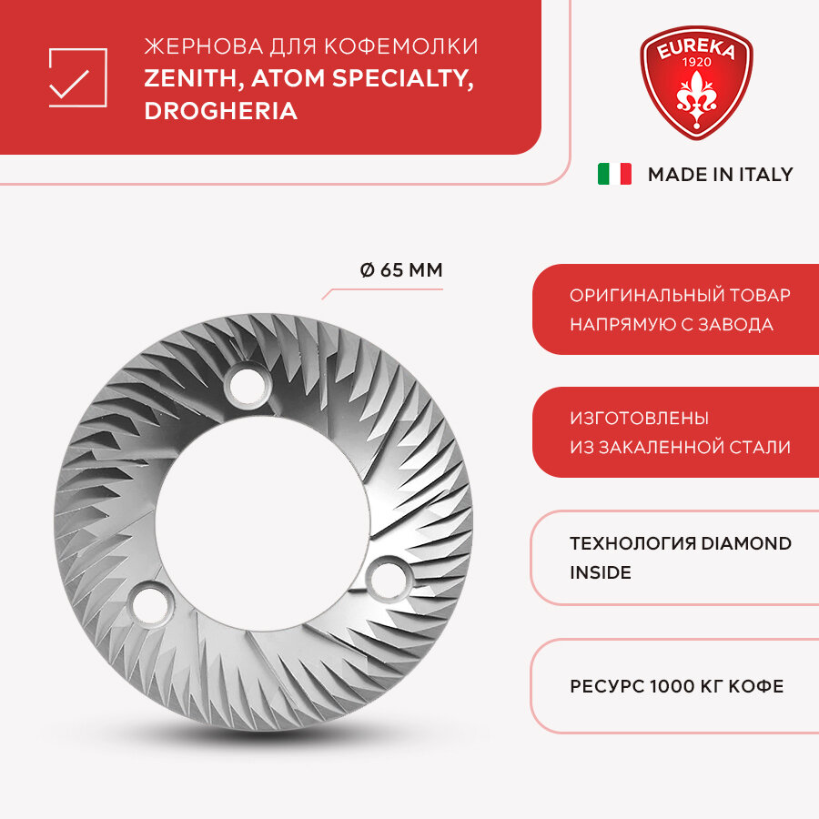 Жернова стальные с технологией diamond inside для кофемолки Eureka Zenith, Atom Specialty, Drogheria, 65 мм интересное: