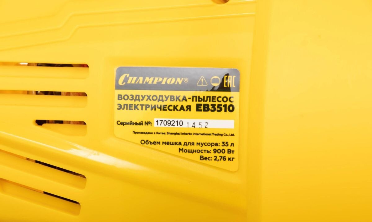 Купить Воздуходувка-пылесос электрическая CHAMPION EB3510 (900 Вт 2,76кг 792 м³/ч 75м/с 35л )