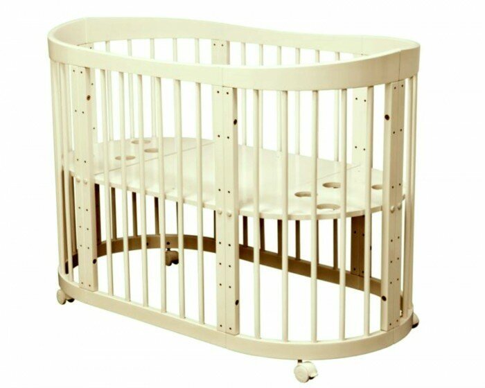 Собрали люльку и для пеленального столика не оказалось 4 гаек-боченков. Также минус в том, что колеса в комплекте к белой кроватки оказались серыми (а ни как на фото). Колеса со стопорами, среднего качества. И конечно же огорчила трещина на боковой стойке. Сама кроватка покрыта эмалью (белая), выглядит гораздо приятнее дешевых аналогов. Пока не эксплуатировали, ждем. Надеюсь что в процессе эксплуатации не развалится. Маятниковые механизмы и для люльки и для овальной кроватки. Возможно установить просто на пол без маятника. Прутья из боковых стенок извлекаются. |