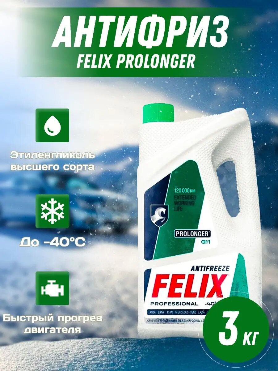 Антифриз Prolonger 3Кг G11 Готовый Зеленый Astm D 3306, Astm D 4985, Sae J 1034, Bs 6580:1992 Felix арт. 430206327