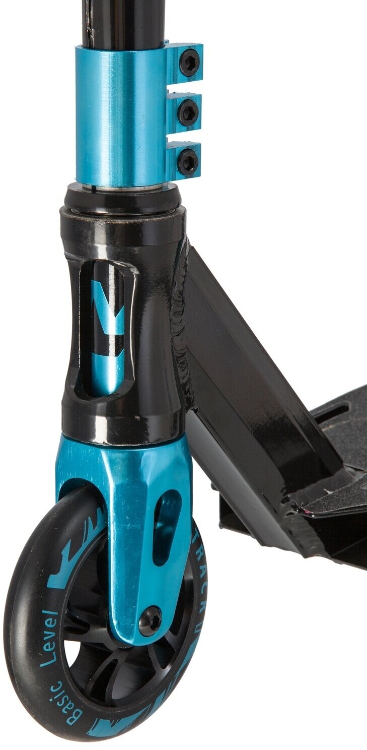 Самокат трюковый NOVATRACK PIXEL BL, колеса 110 мм с алюмин.ободом, зажим 3 болта, стальной удлиненный Y-руль , алюмин.вилка, пром.подшипник,черно-синий.