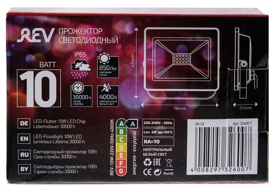 Прожектор светодиодный REV, 10 Вт, 4000 К, 800 Лм, IP65 интересное: