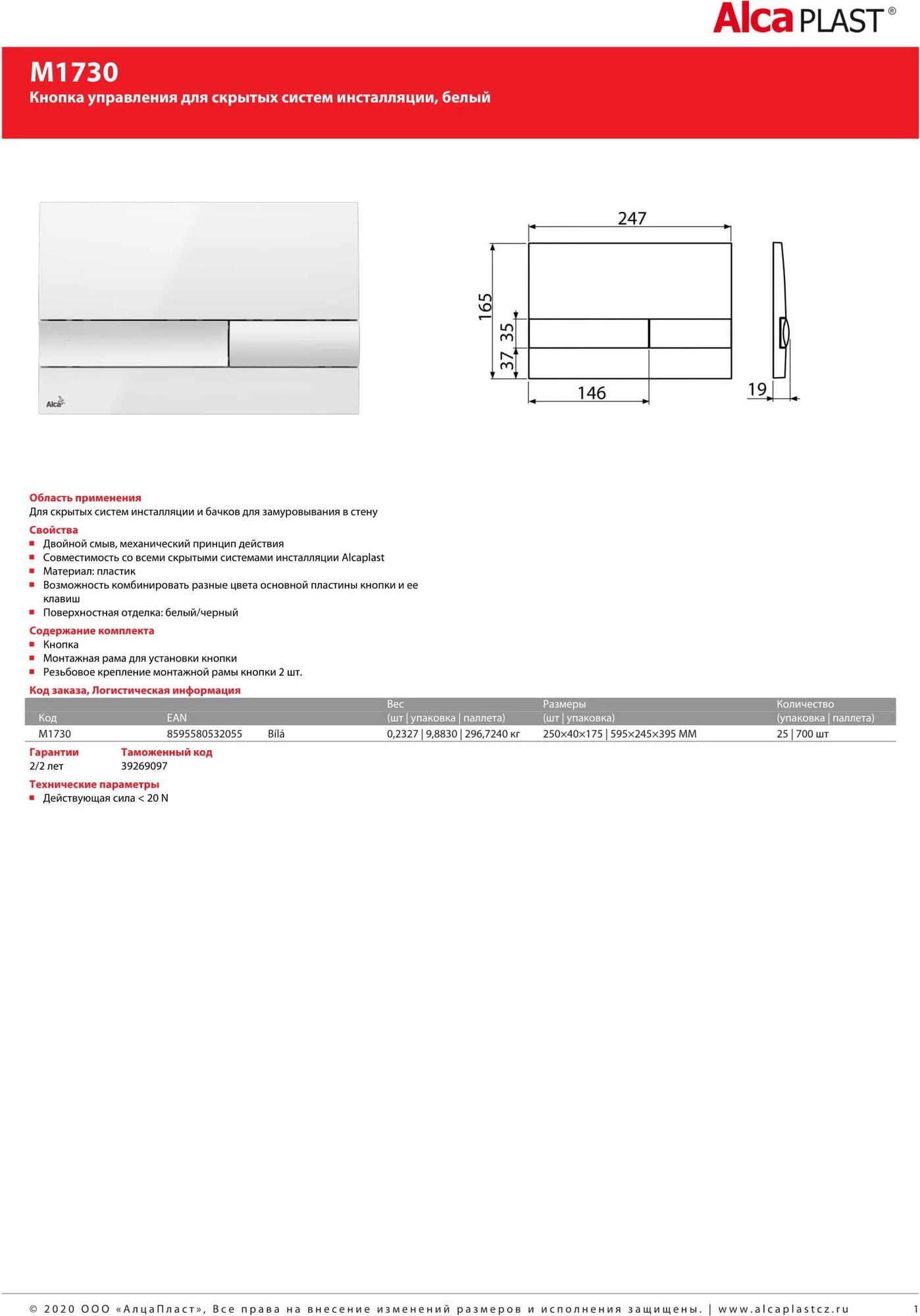 Кнопка смыва Alca Plast 24.7х1.9х16.5 для инсталляции, пластик, цвет Белый (M1730)